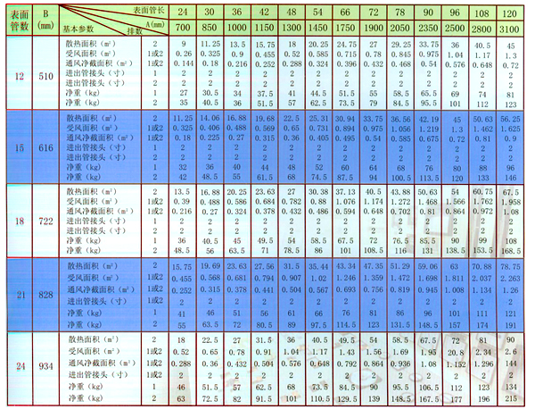 如采用兩排,片距為3.2mm,表面管數為2l,管長(cháng)為60英寸,